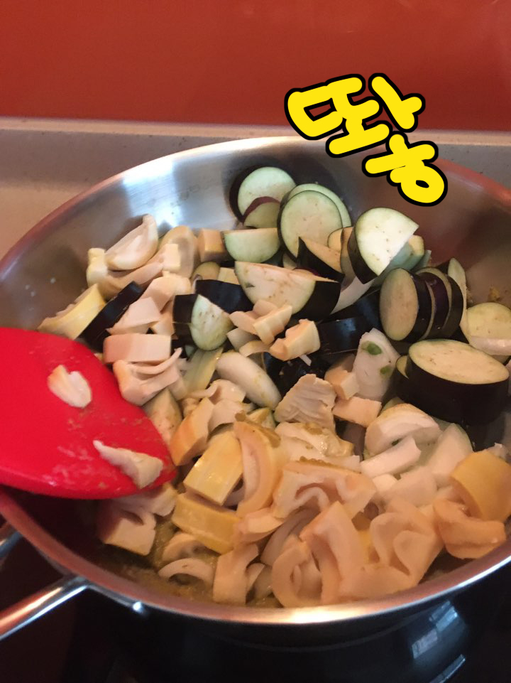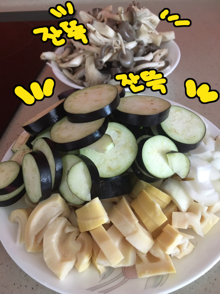 냉장고에 있던 각종 채소들_가지, 양파, 죽순, 버섯